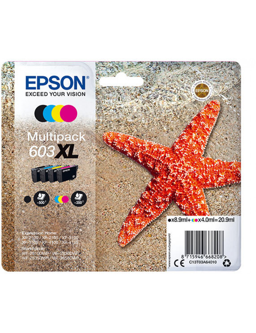 Epson C13T03A64010 Tintenpatronen Multipack 603XL "Seestern" Farbe: Schwarz, Cyan, Magenta, Gelb Inhalt: 1x ca. 8,9 ml & 3x je ca. 4,0 ml Kompatibel zu: Epson XP-2100 / XP-2105 / XP-3100 / XP-3105 / XP-4100 XP-4105 / WF-2810DWF / WF-2830DWF / WF-2835DWF / WF-2850DWF